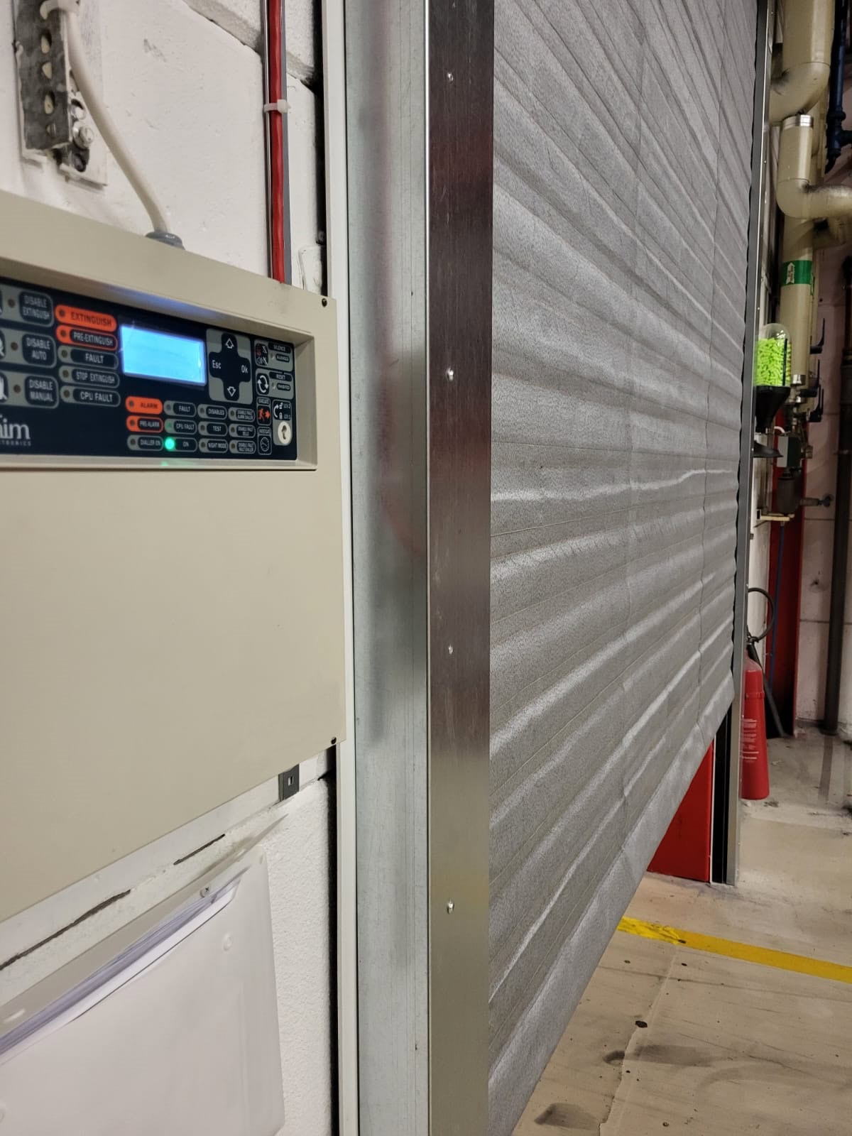Vi fick även möjligheten att ta fram en smidig lösning för kundens truckladdningsrum. Väldigt begränsat med plats samt krav på utrymningsdörr är ofta ett problem vi stöter på. Vår sidogående modell SGS EI60 med integrerad gångdörr blev bästa lösningen. Vår Slidetronic 230V (styrskåp) kommer att sköta övervakningen av porten.