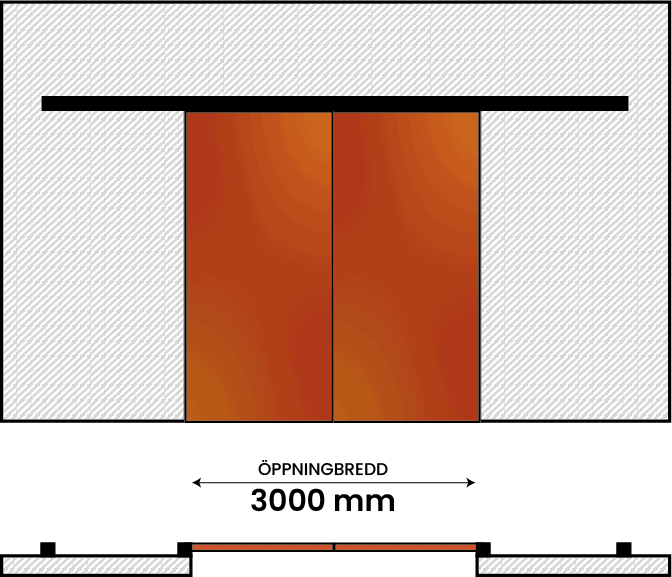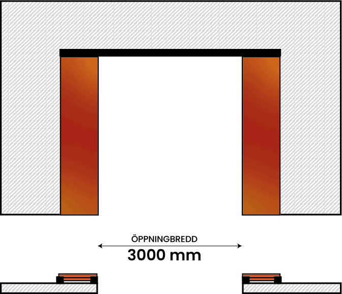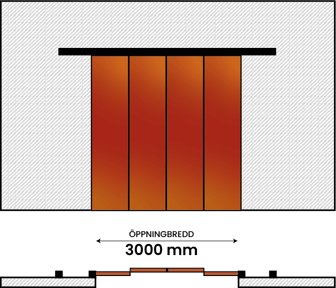 Den dubbelflygliga brandskjutporten består av två fasta portblad som löper utanpå väggen i var sin riktning.
